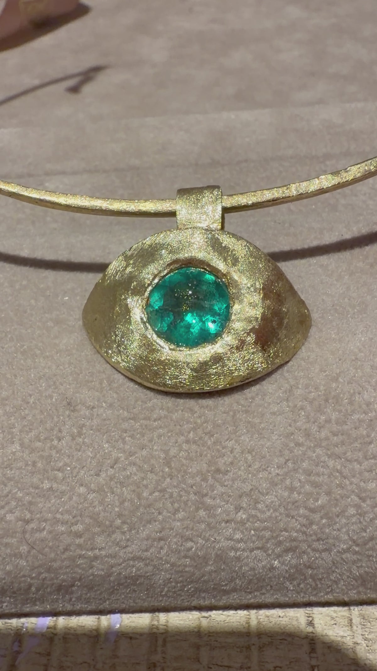“Esmeralda Eye” Certified 2 Ct Emerald Round Large Evil Eye Wire Collar Necklace 18 Ct Gold