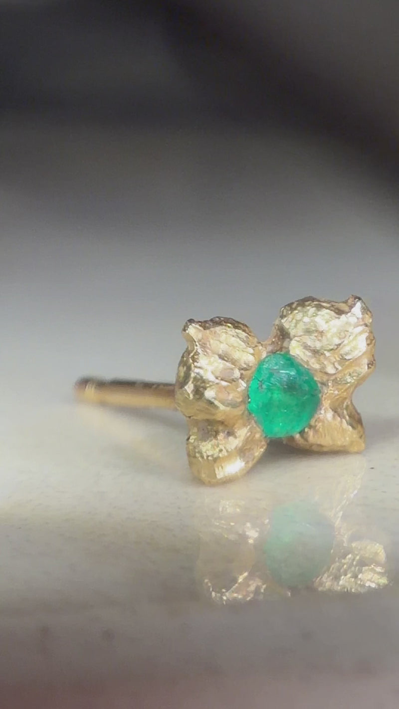 Hand-sculpted in 18 ct yellow gold, these miniature butterfly stud earrings are formed with textured wings, shaped by hand to catch the light with every movement. At the centre, a vivid Colombian emerald and a deep pink ruby glow like tiny jewels carried in flight.