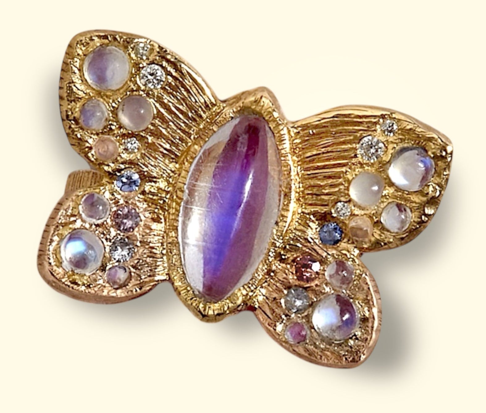 “Winterfly” 18 Ct Gold Moonstones & Diamonds Art Ring at Tomfoolery London