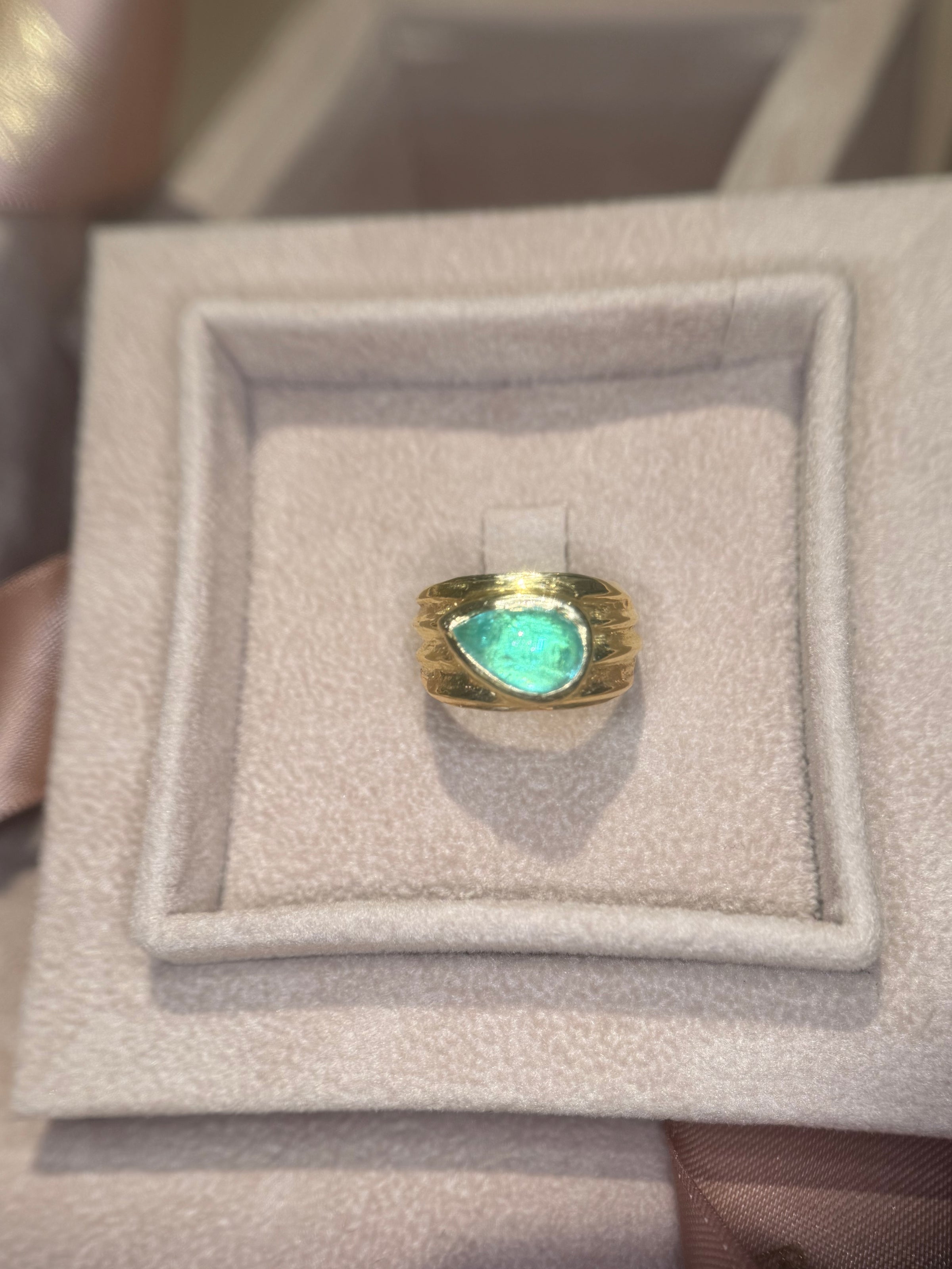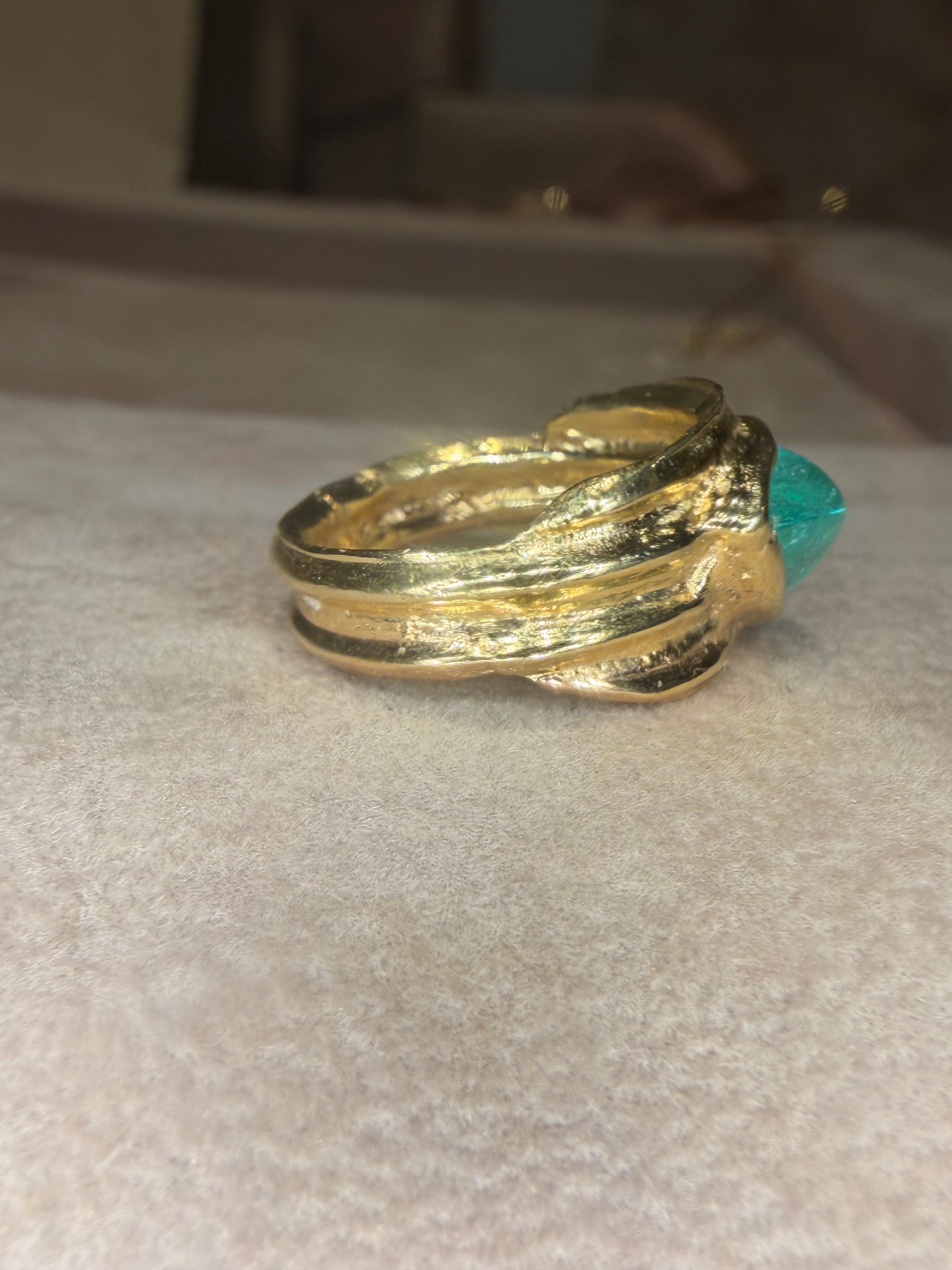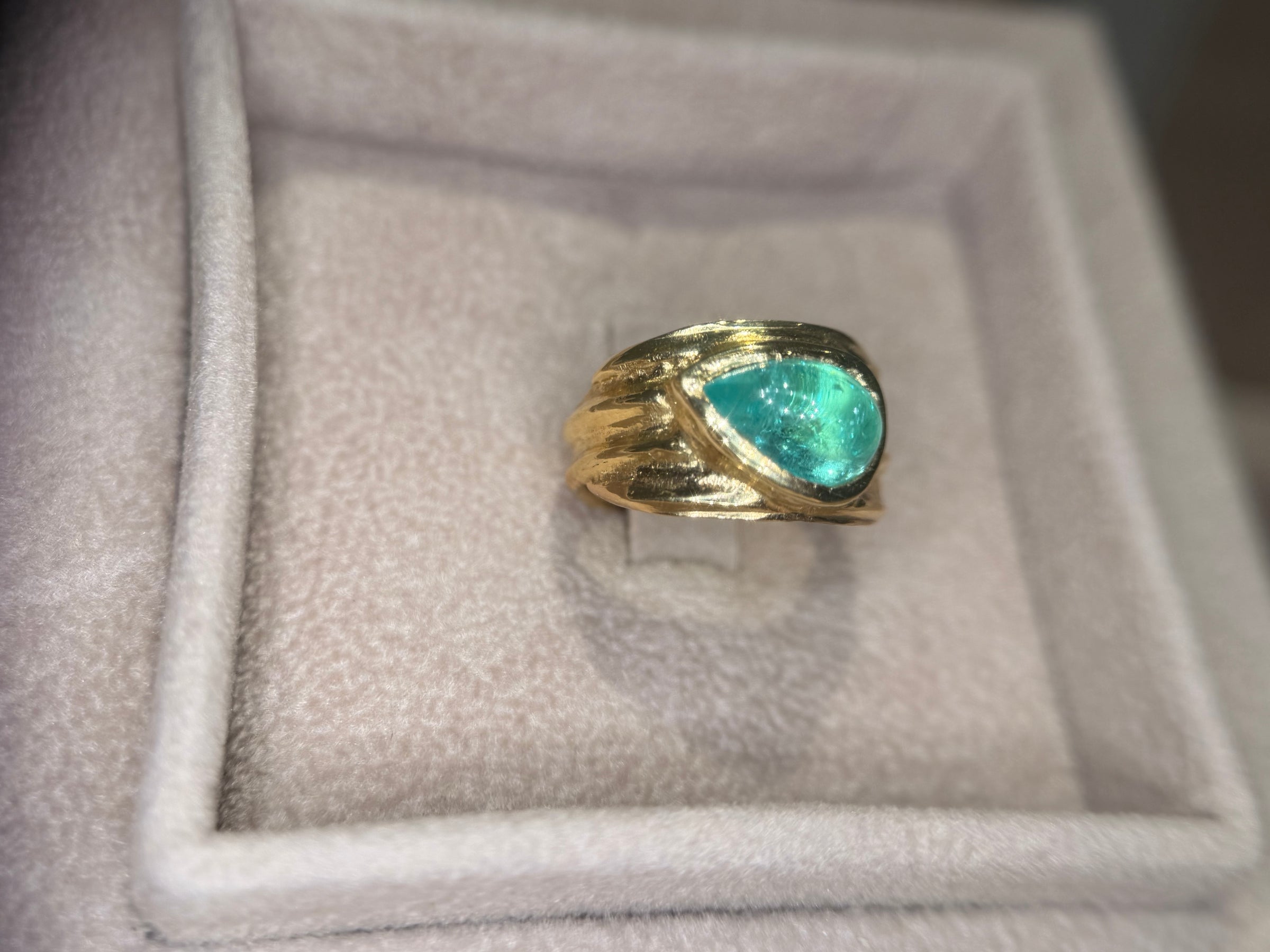 This sculptural 18-carat yellow gold cigar ring features a 2.5-carat pear-shaped Paraíba tourmaline cabochon from Mozambique, glowing with oceanic luminosity. Inspired by archaic jewellery traditions, the cabochon is placed sideways across the band, giving a contemporary modern twist to a timeless silhouette.